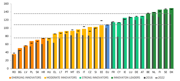 The latest European Innovation Scoreboard was published by the European Commission on July 6th, 2023. In the 2023 European Innovation Scoreboard, Malta scored 85.8% of the EU average, placing it as a Moderate Innovator. The group of Moderate Innovators includes 10 Member States with an average of 86.1%. Malta is amongst 1 of 15 Member States whose performance has grown at a faster rate than that of the EU between 2016 and 2023. Malta’s performance increase, between 2016 and 2023 is at 10.9% ...