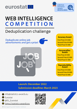 Eurostat is pleased to announce the Web Intelligence Competition as part of the European Statistics Awards Program. The competition aims at stimulating innovation in the area of Web Intelligence for European statistics. The Web Intelligence DEDUPLICATION CHALLENGE will focus on identifying potential duplicate job postings on websites as a basic condition to produce high quality statistics from online job advertisements. Registration for participation will be ...